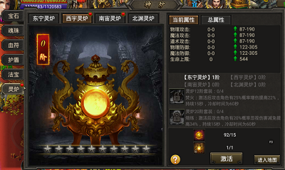 系统介绍:灵炉共有四种(东宁/西宇/南宙/北渊),每种灵炉需要对应图鉴+灵炉精粹激活(图鉴可在专属地图中击杀BOSS掉落),激活后使用灵炉碎片+灵炉精粹可升级灵炉获得攻击、双防、生命、增伤等超强属性加成!